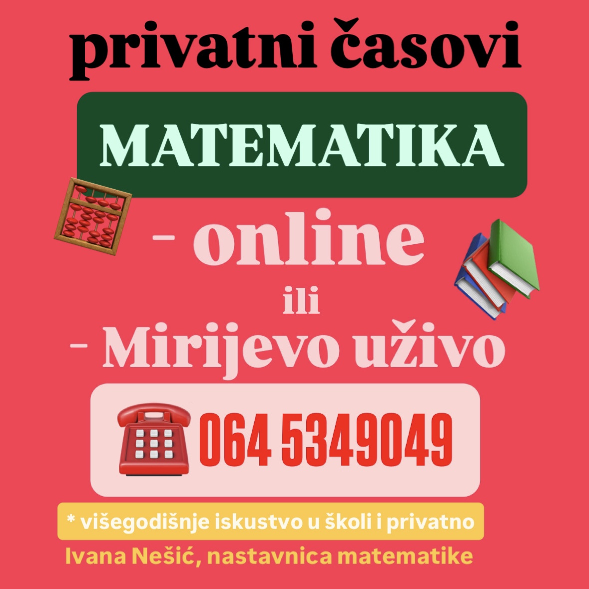 Predajem matematiku u osnovnoj skoli i drzim privatne casove iz matematike za OSNOVCE i SREDNJOSKOLCE.