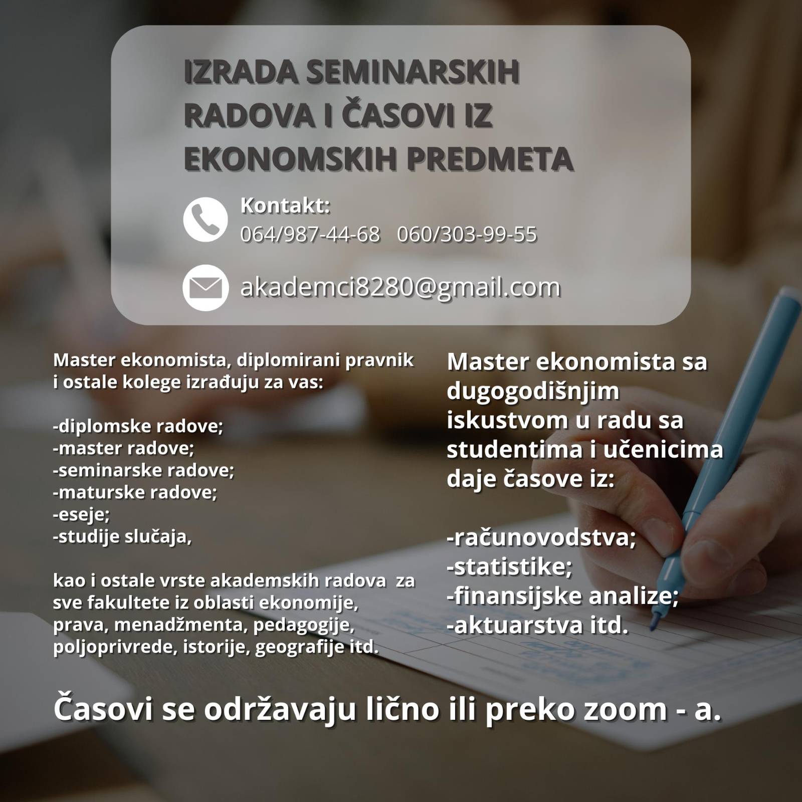 Izrada studija slučaja, obrada i analiza statističkih – empirijskih podataka, kao i izrada radova sopstvenim rečima, prepričavanje, autentično i veoma povoljno. Imamo visegodisnje iskustvo i u pisanju radova (Seminarski, Diplomski, Master….). Tim čine pravnici, ekonomisti, sociolozi i stručnjaci iz ostalih nauka. U najkracem roku cemo odgovoriti na Vašu zadatu temu iz oblasti ekonomije, menadžmenta, prava, sociologije, geografije i mnogih drugih oblasti. Radimo i prevode sa engleskog jezika na srpski jezik. Kontakt: akademci8280@gmail.com 064/987-4468