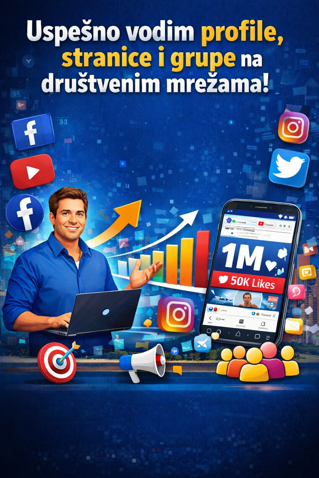 Uspešno vodim profile, stranice i grupe na društvenim mrežama. Specijalnost mi je Facebook gde sam mnoge stranice podigao do desetina hiljada pratilaca i kreirao objave sa milionskim pregledima. Pratim trendove, uspešno targetiram željenu publiku, a i aktivan sam na većini društvenih mreža.
